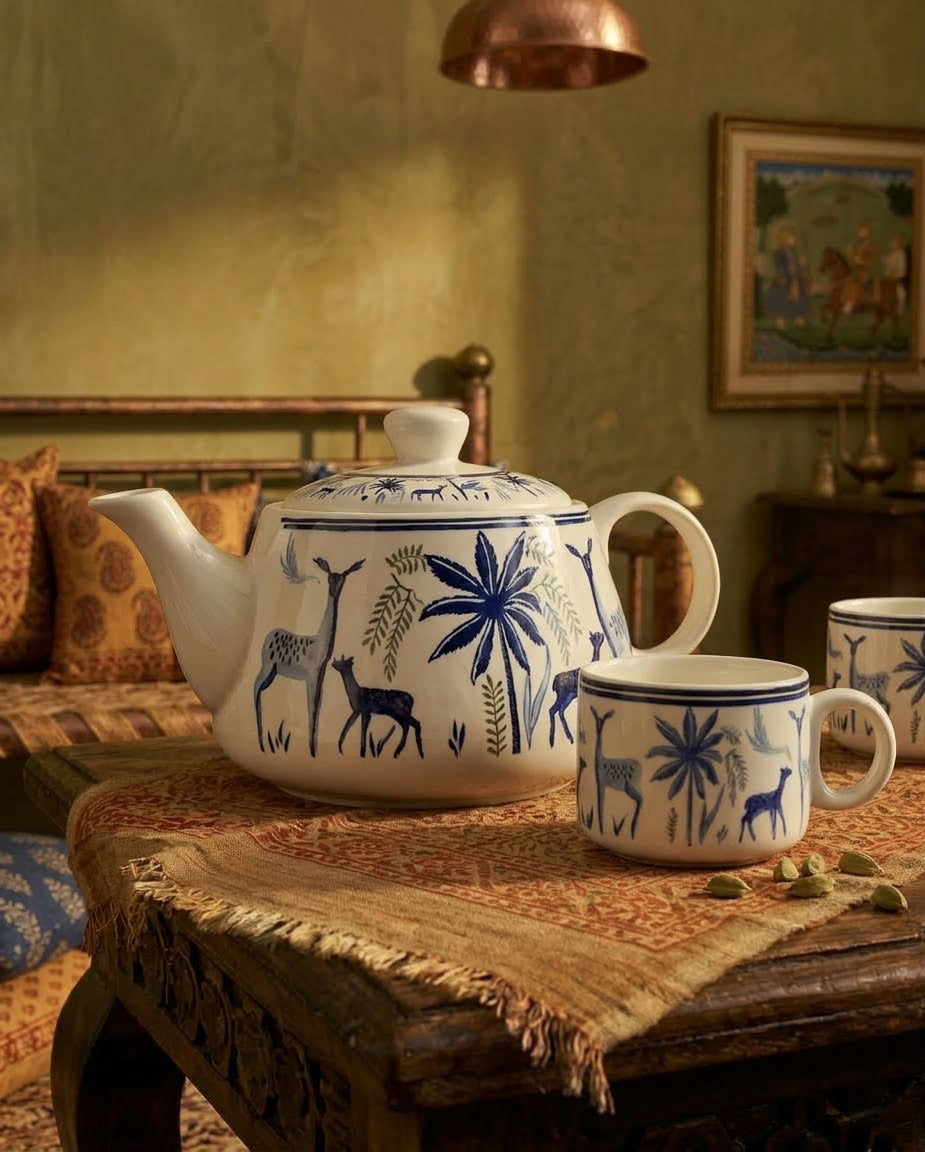 Adorned in a soothing ivory and deep blue palette, each piece features a nature-led stag motif that feels both timeless and evocative, like a scene borrowed from old-world craft traditions and reimagined for modern homes. Whether styled for a serene morning tea ritual, a beautifully laid-out gathering, or simply displayed as a decorative statement in your kitchen or dining space, this set adds elegance, character, and quiet sophistication.